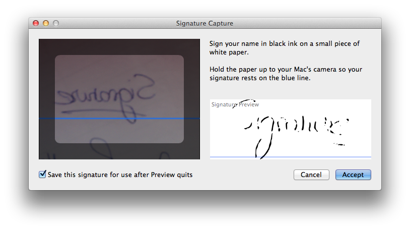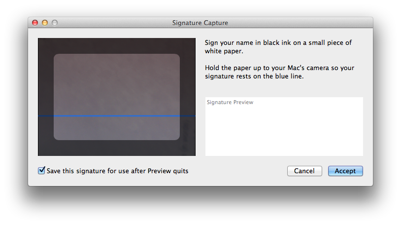 - You will see a window for capturing the signature that comes up. This window turns on the built-in iSight camera for capturing the signature.