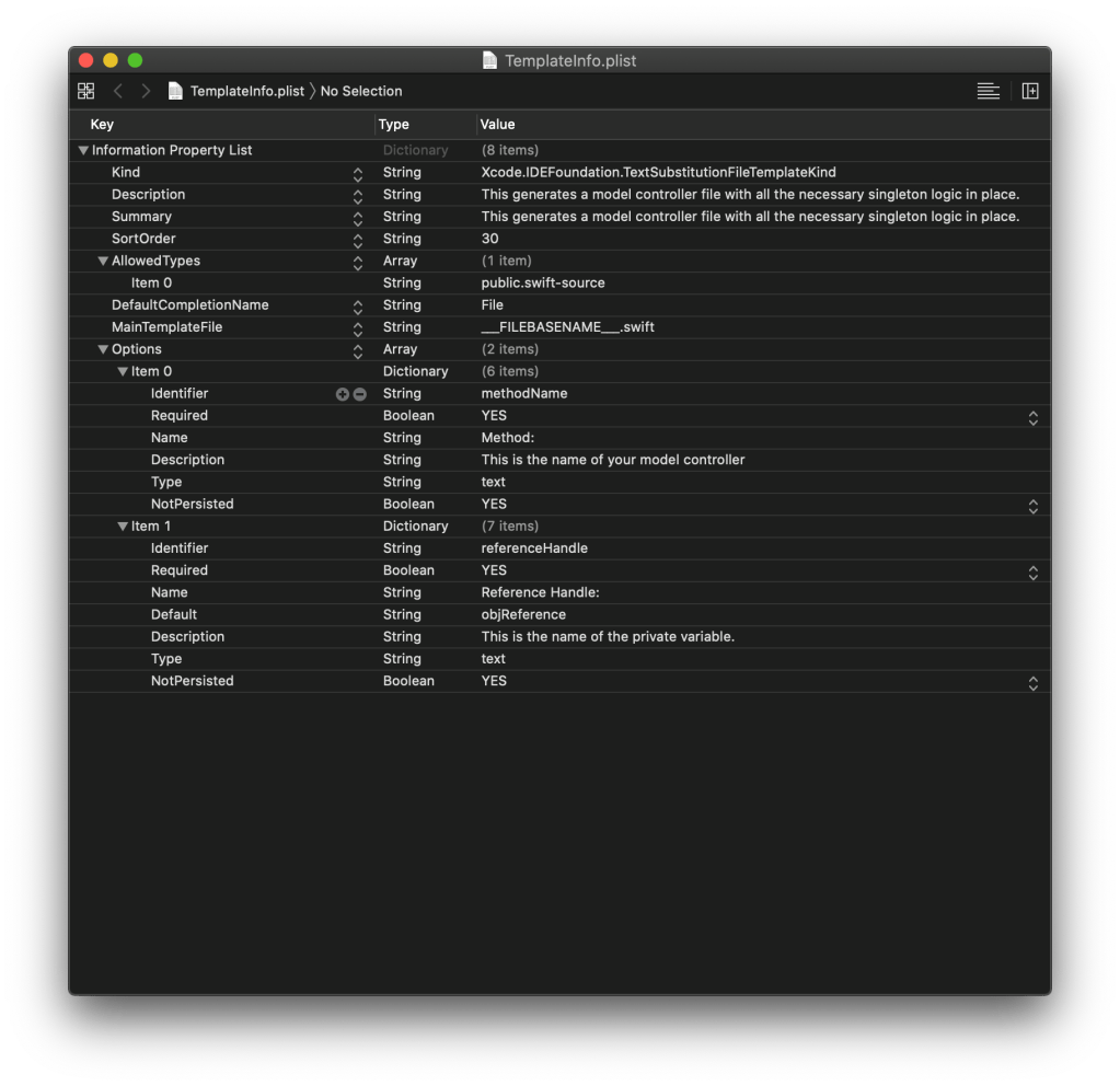 For example, ___FILEBASENAMEASIDENTIFIER___ which is used to specify the class name. We will examine these later once we are done implementing the TemplateInfo.plist file.